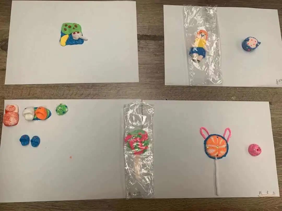 第一节课是创意粘土志愿者们首先讲解关于超轻粘土的基本知识,包括超轻粘土的特点,色彩的混合方法,正方体、球体、水滴形、圆筒形、细长条装等基本形状的捏法等。讲解结束后小朋友们迫不及待地开始自己的“创作之旅”。他们有的参照志愿者们提供的图片进行制作,有的比照自己喜欢的事物,还有小朋友互相学习一起协作完成作品。