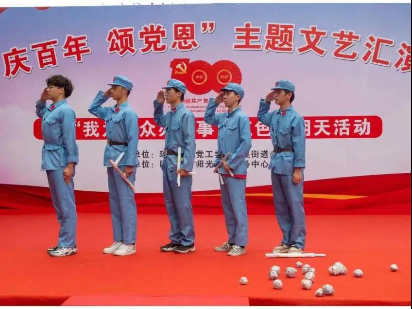 队员们采用短视频录制,介绍了优秀共产党员的革命精神和非凡伟绩,我们通过抖音、微信等平台将红色经典人物进行传播;为协助瑶溪阳光党群服务中心举办“庆百年,颂党恩”文艺汇演,队员们演出的《时装年代秀》。从五四运动,一场以青年阶级为主的群众爱国运动,到狼牙山五壮士,为抗击日军他们用生命和鲜血谱写出一首气吞山河的壮丽诗篇,紧接着新时代改革开放的女青年逐一上场穿着各式各样的衣服自信的在场上展示,随后重现2008年北京奥运会开幕式在国家体育场隆重举行,最后的抗疫前线的最美逆行者们,都彰显了这个时代的风华正茂。