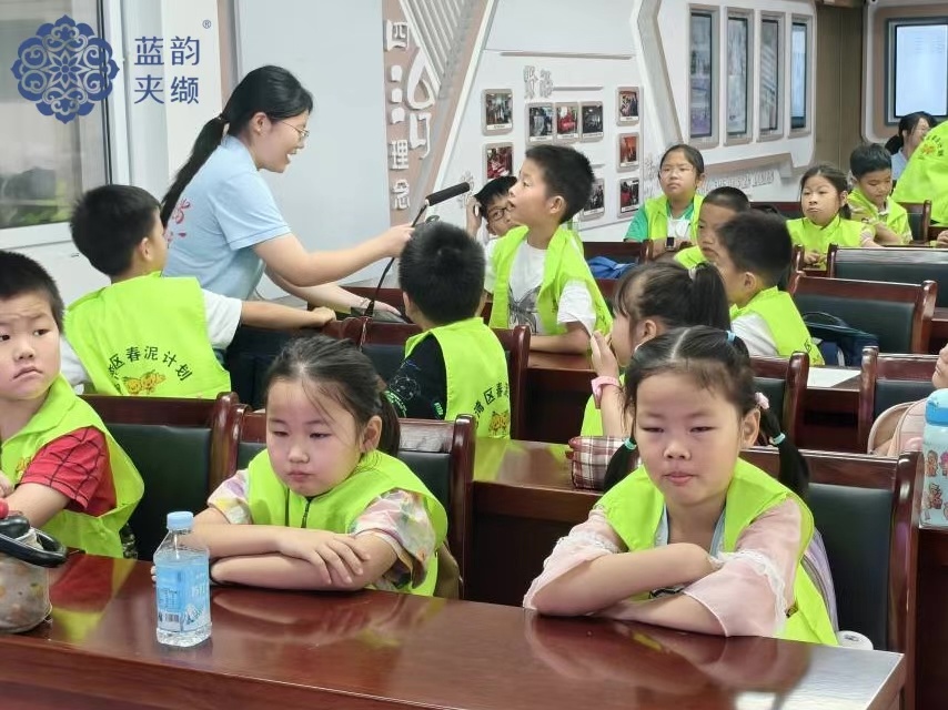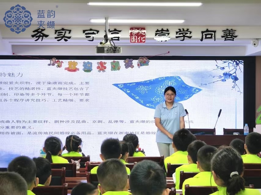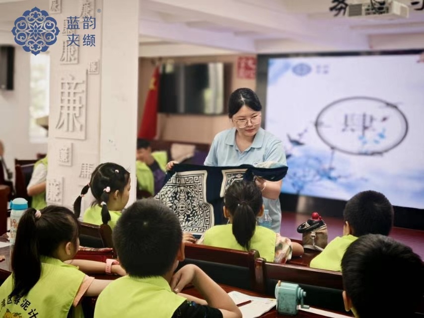活动伊始,实践队队员王雯雯以生动的讲述,引领孩子们步入靛蓝世界的大门。从蓝夹缬的历史脉络、独特工艺到繁复典雅的纹样,孩子们听的全神贯注,发出阵阵惊叹。