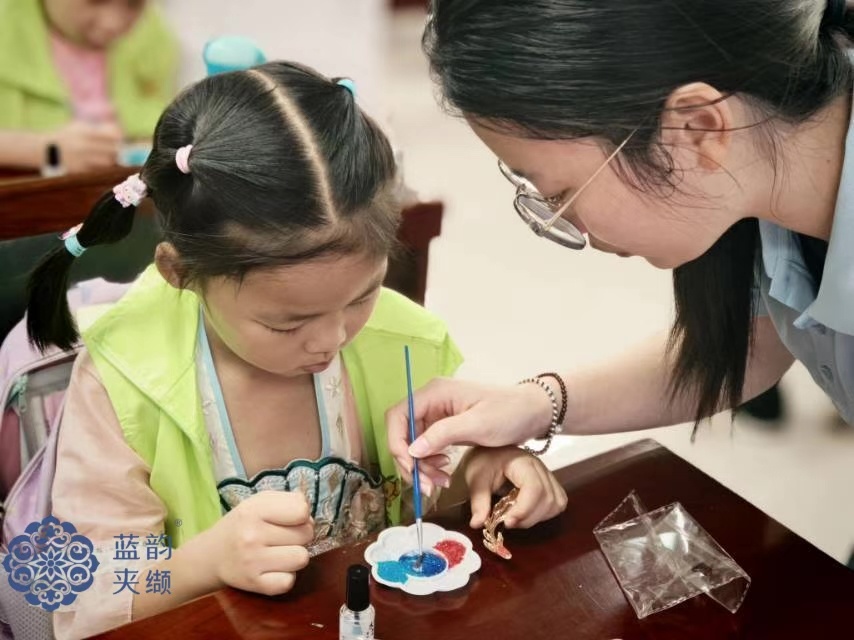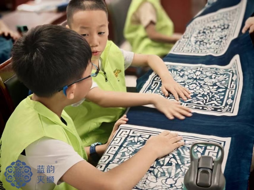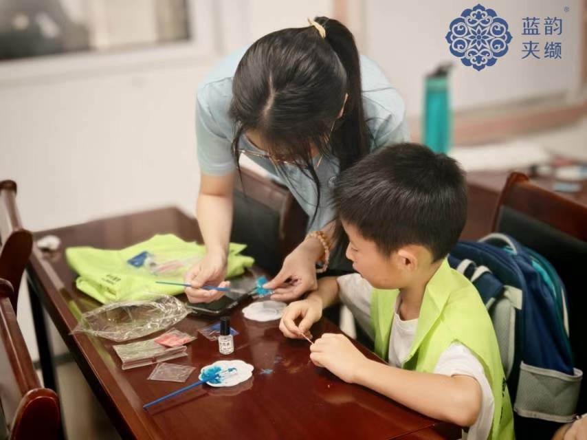 7月14日上午,浙江东方职业技术学院“蓝韵夹缬”实践队携手“火眼金睛”社会实践队,共同走进望海社区,为孩子们带来了一场沉浸式蓝夹缬文化体验之旅。两队青年学子以匠心与热忱,在童真的心田播撒蓝夹缬的种子,让千年技艺绽放时代新芽。