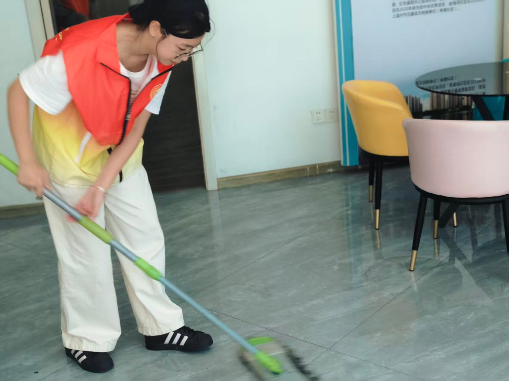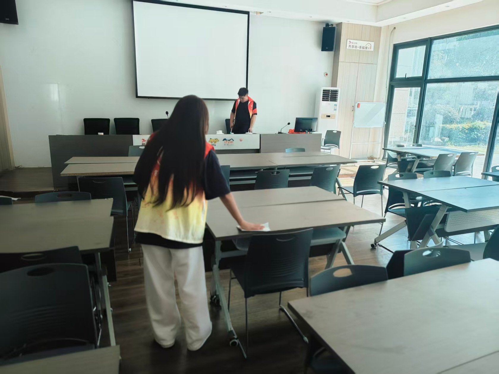 抵达现场后,志愿者们迅速进入状态、高效分工:一组沿着活动中心大厅、阅览室等公共区域细致巡查,将散落的废纸、塑料瓶、零食残渣等垃圾逐一收集;另一组则对照垃圾分类标准,对收集的垃圾逐一甄别、精准分拣。