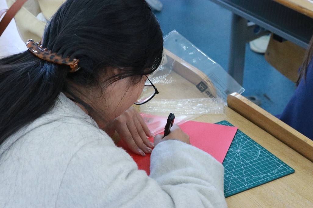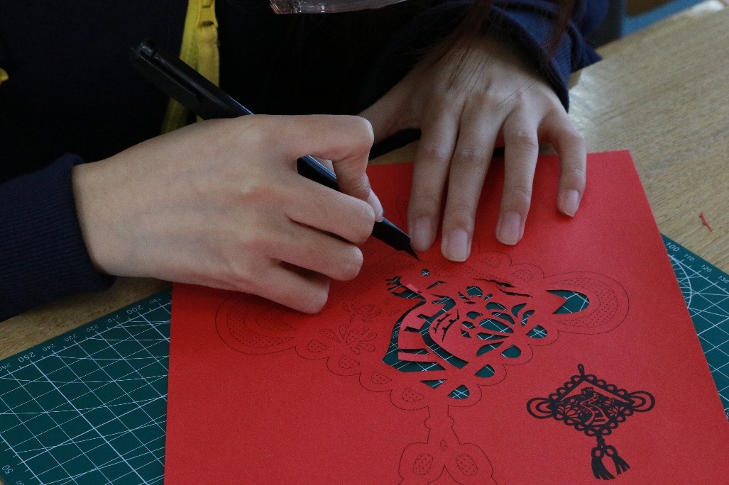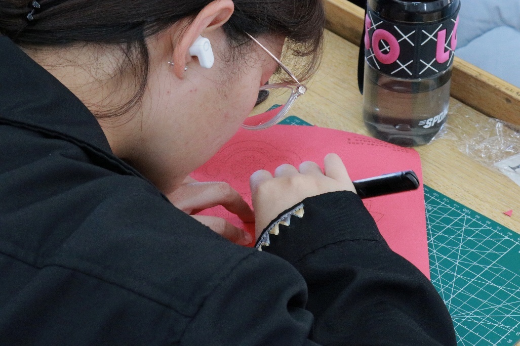 活动现场洋溢着治愈人心的氛围,没有喧嚣纷扰,唯有刻刀划过红纸的沙沙声轻缓流淌,偶尔穿插着“这个花纹怎么勾勒更流畅?”“我这处线条剪偏啦,帮我看看怎么调整~”的轻声探讨。不少同学初握刻刀时难免手微颤、心发慌,但跟着示范一步步描摹轮廓、雕琢细节,浮躁心绪渐渐沉淀,全神贯注于指尖的创作——生活的烦忧琐碎被暂时搁置,唯有红纸与刻刀相伴,当一个个蕴含家国暖意的纹样在纸上徐徐浮现,满满的成就感在心底悄然升腾。