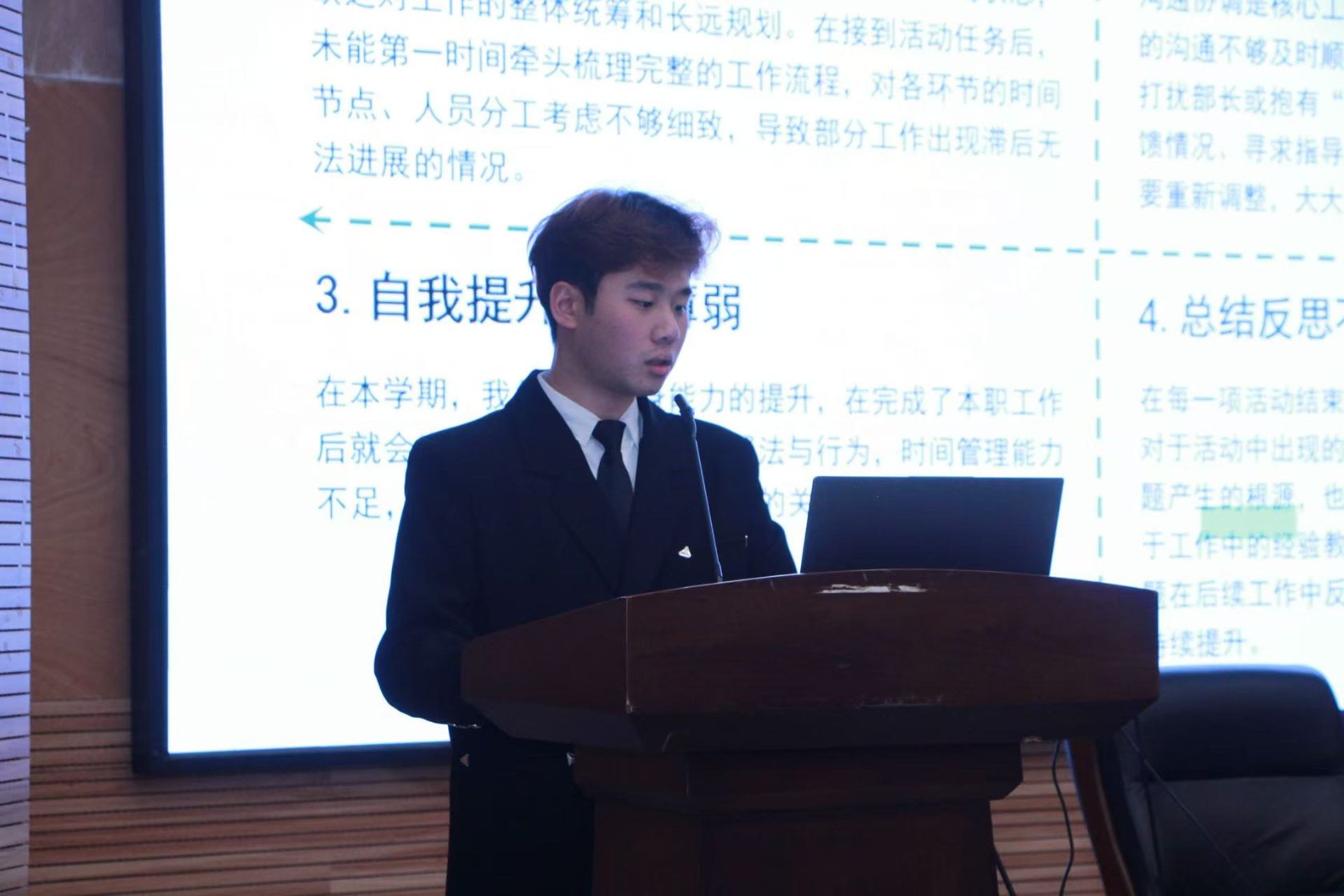 会议伊始,各团学干部按照抽签顺序依次上台述职。大家以凝练务实的语言梳理本学期工作核心脉络,立足自身职能定位与岗位工作重点,从实践成效、服务落实、活动运营、需求对接、组织建设等多个维度,全面复盘年度工作亮点与实绩,同时深刻反思工作推进中的短板与不足。全体干部均紧扣“总结过往、反思不足、谋划未来”的清晰思路,全方位、多角度呈现了本年度团学工作的完整成效与推进全貌。