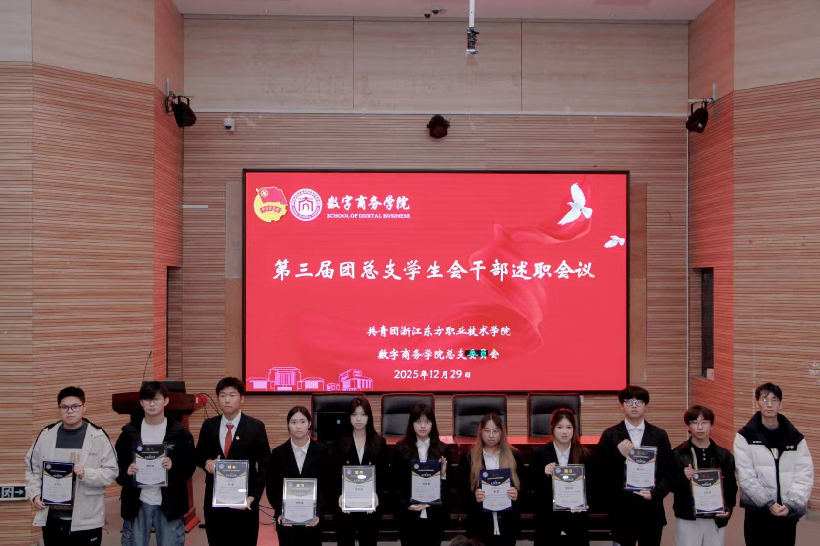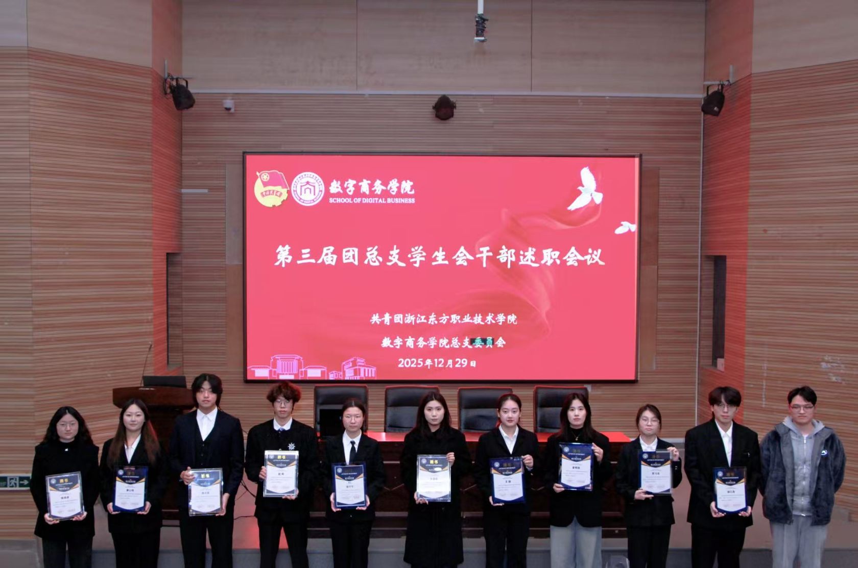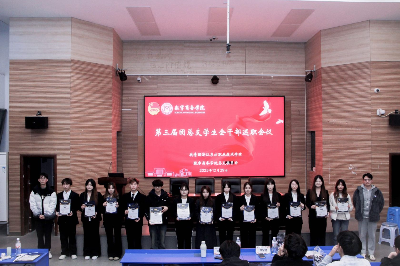 述职结束后,学院领导依次为全体团学干部颁发受聘证书,这份证书既是对大家过往工作的肯定与认可,更承载着学院的殷切期许,赋予了全体干部一份沉甸甸的责任与担当。