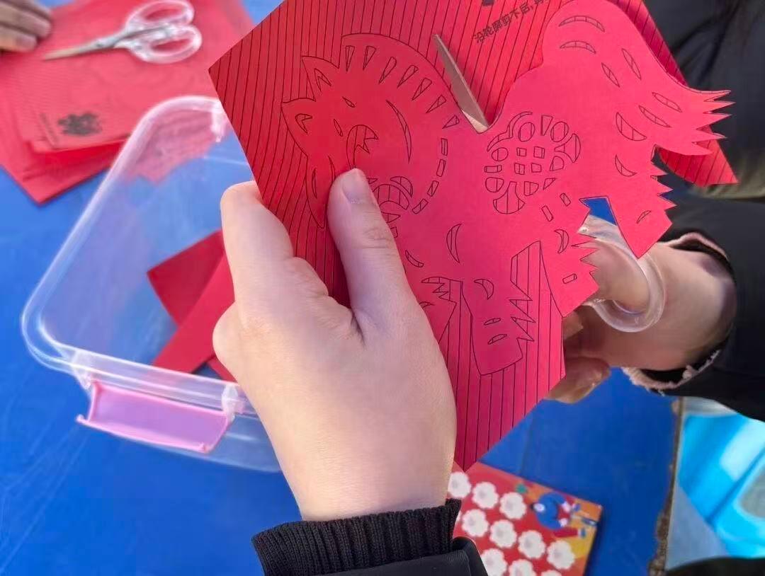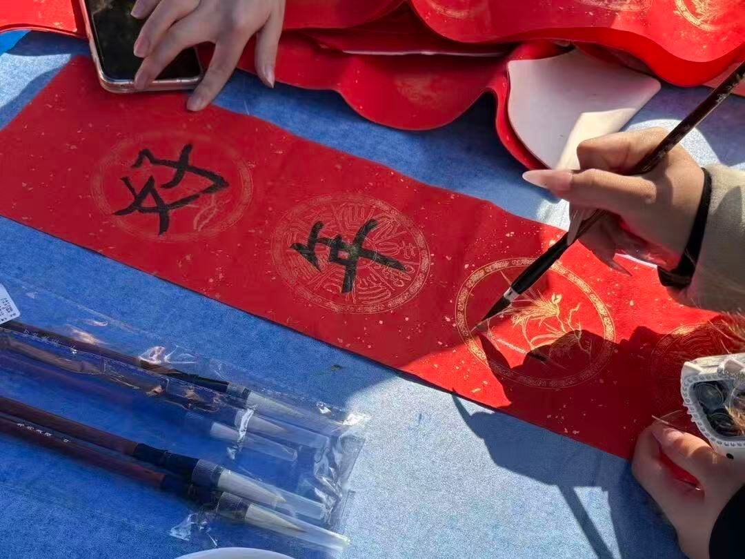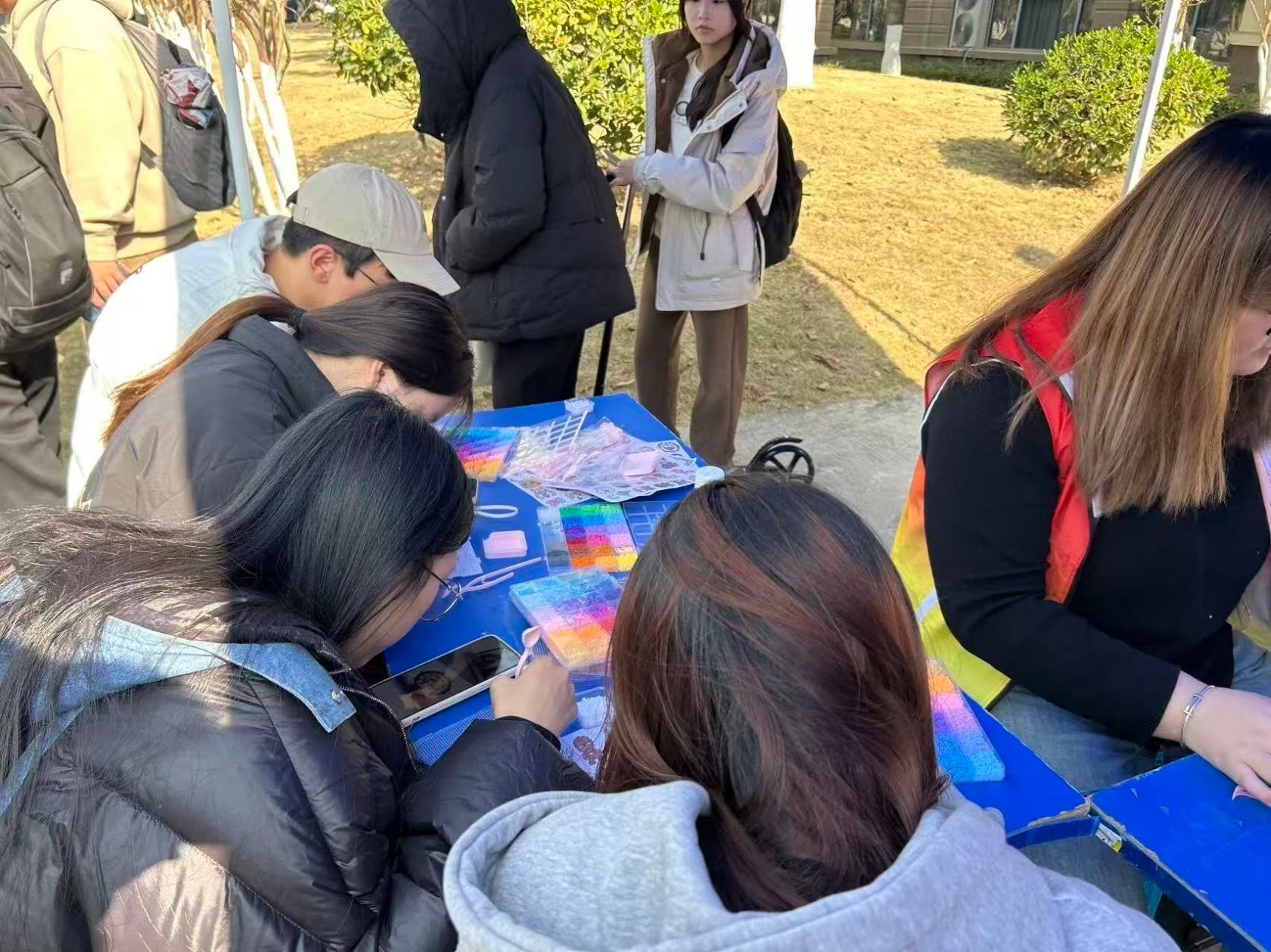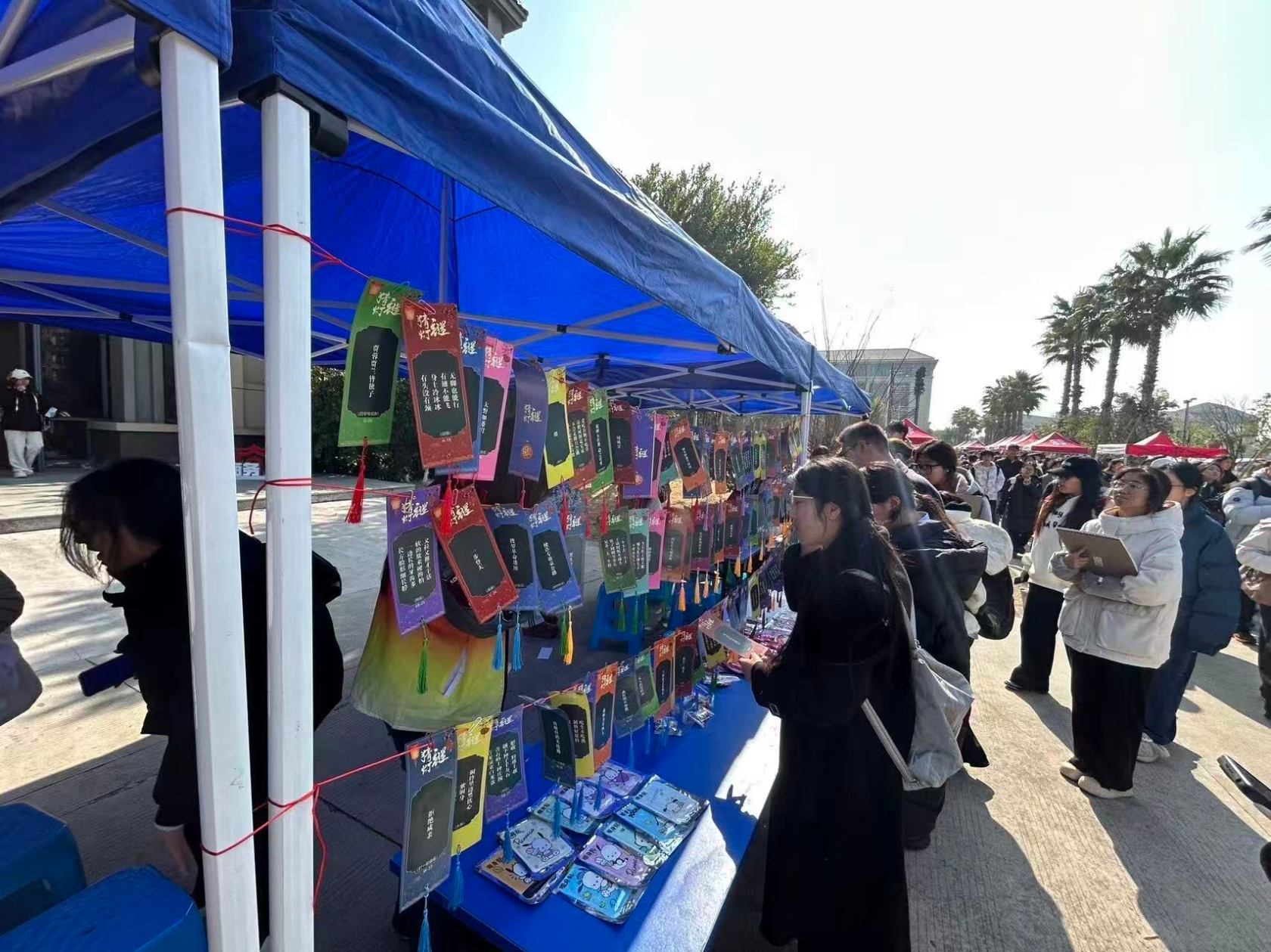 活动当日,教四大门口年味氤氲、热闹纷呈,各趣味摊位前人头攒动。对联创作区,学子妙笔书吉祥,尽显文思才情;缝香包区暖意融融,巧手纳福,满载新春祈愿;拼豆DIY区创意迸发,五彩拼豆拼出新年萌趣模样;猜灯谜区学子争相竞答,欢声不断,点燃现场氛围;剪纸送福区红纸飞舞,一幅幅吉祥纹样,寄托着师生对新岁的万般期许。