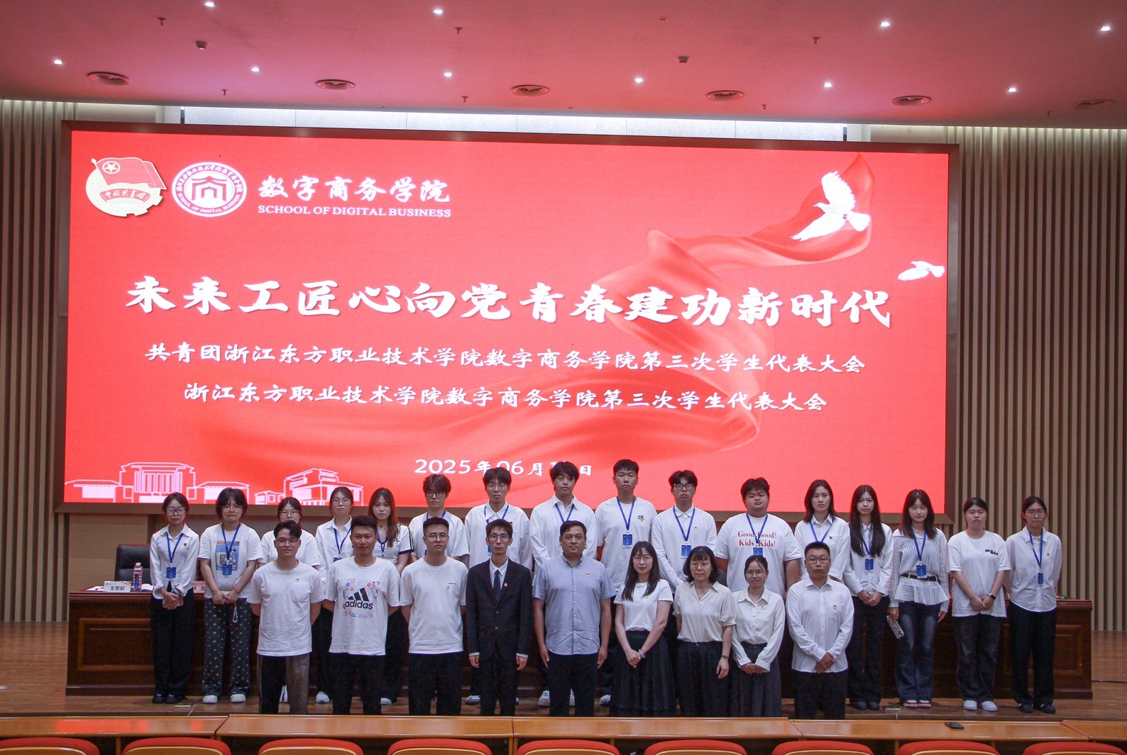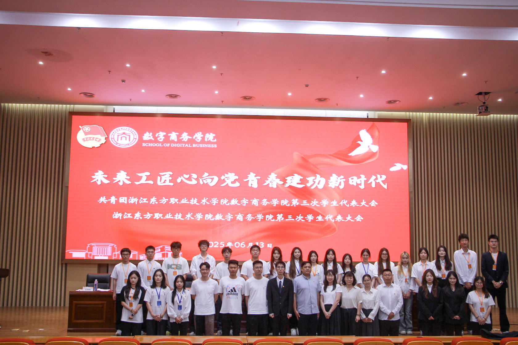 青春的号角激昂奏响,澎湃出时代的铿锵强音;青春的旗帜猎猎飘扬,引领着奋进的浩荡方向。2025年6月13日,数字商务学院第三次团员、学生代表大会于行政楼学生报告厅盛大启幕。学院领导、教师与众多学生代表齐聚一堂,共同见证这一意义非凡的重要时刻,携手为学院团学工作的未来发展擘画宏伟蓝图。
