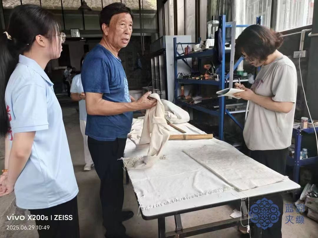 走进王河生老师的工作室,泛黄的典籍与斑驳的雕花木板无声诉说着历史。王河生老师轻抚木版,目光灼灼:“唐宋时,夹缬是宫廷里的‘软黄金’;明清年间,蓝夹缬的兴盛又成了百姓被面上的吉祥图腾。可如今,化学染料的大行其道,机器的轰鸣却让这门手艺濒临失传。” 他的话语如重锤,敲醒了队员们心中守护非遗的使命感。队员小李忍不住轻抚案头的绸缎,仿佛触碰到了匠人们跨越时空的温度。