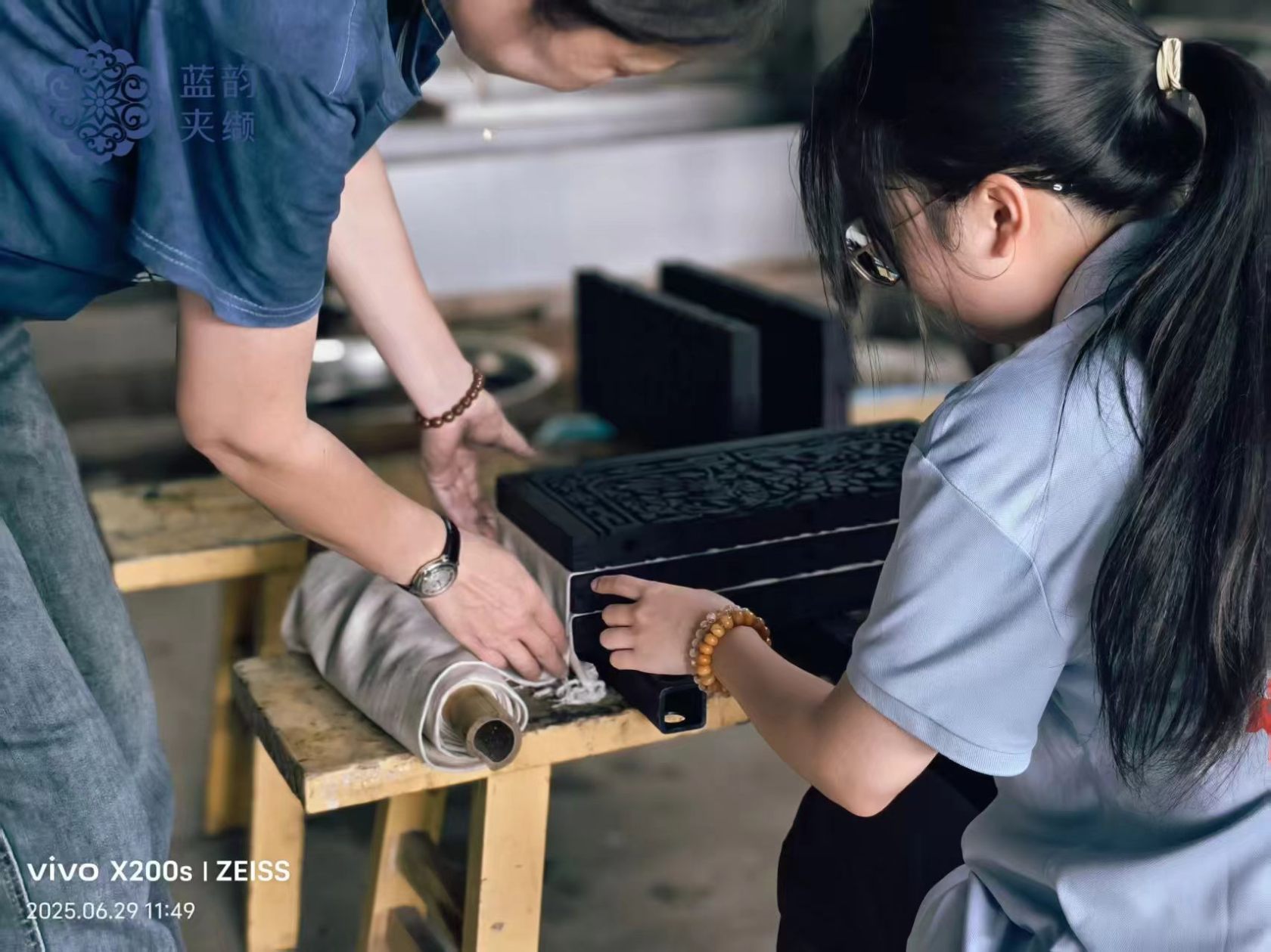 染坊内,蒸腾的热气中弥漫着板蓝根发酵的独特气息。队员们分组体验印染,将素布铺进刻满狮子、团花纹样的雕花木板。“这染液可是板蓝根历经漫长多次时间的沉淀。” 王河生老师一边示范,一边叮嘱,“时间稍有偏差,颜色便会失了神韵。”当木板缓缓开启,蓝白交织的图案如月光般倾泻而出,美轮美奂。