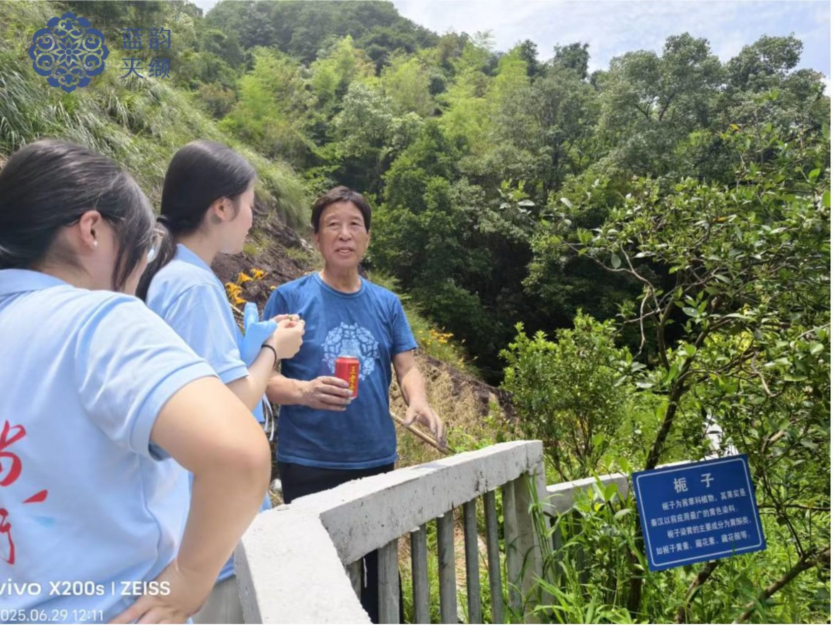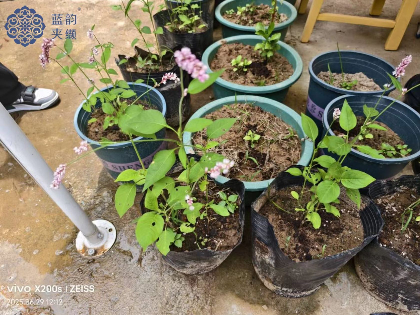 在板蓝根种植基地,翠绿的叶片在风中沙沙作响。王河生老师摘下一片叶子:“你们看,这平凡的小草,经过晾晒、浸泡、发酵,就能化身永不褪色的靛蓝。” 队员们亲手采摘叶片,感受着从土地到染缸的生命蜕变,真切体会到一块蓝夹缬布料背后凝聚的智慧与匠心。