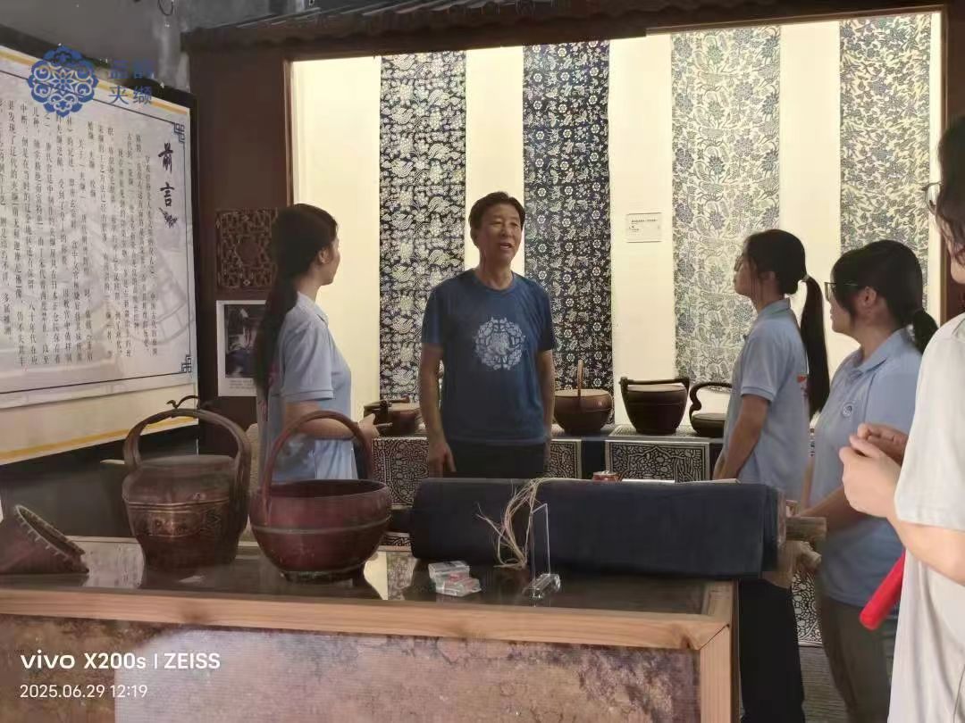 蓝夹缬博物馆里,以蓝夹缬呈现的《西厢记》长卷惊艳众人。靛蓝色调层层晕染,张生的儒雅、崔莺莺的娇羞跃然布上。王河生老师的讲解如抽丝剥茧:“每一道刻痕,都是匠人与时光的对话;每一抹靛蓝,都承载着百姓对美满的祈愿。” 队员们纷纷举着相机,镜头里定格的不仅是纹样,更是千年文明的薪火相传。