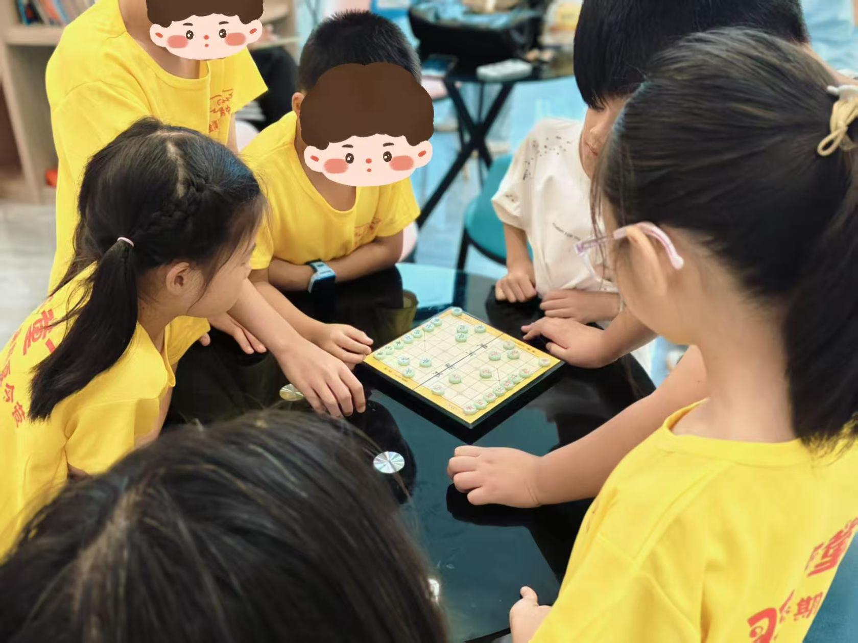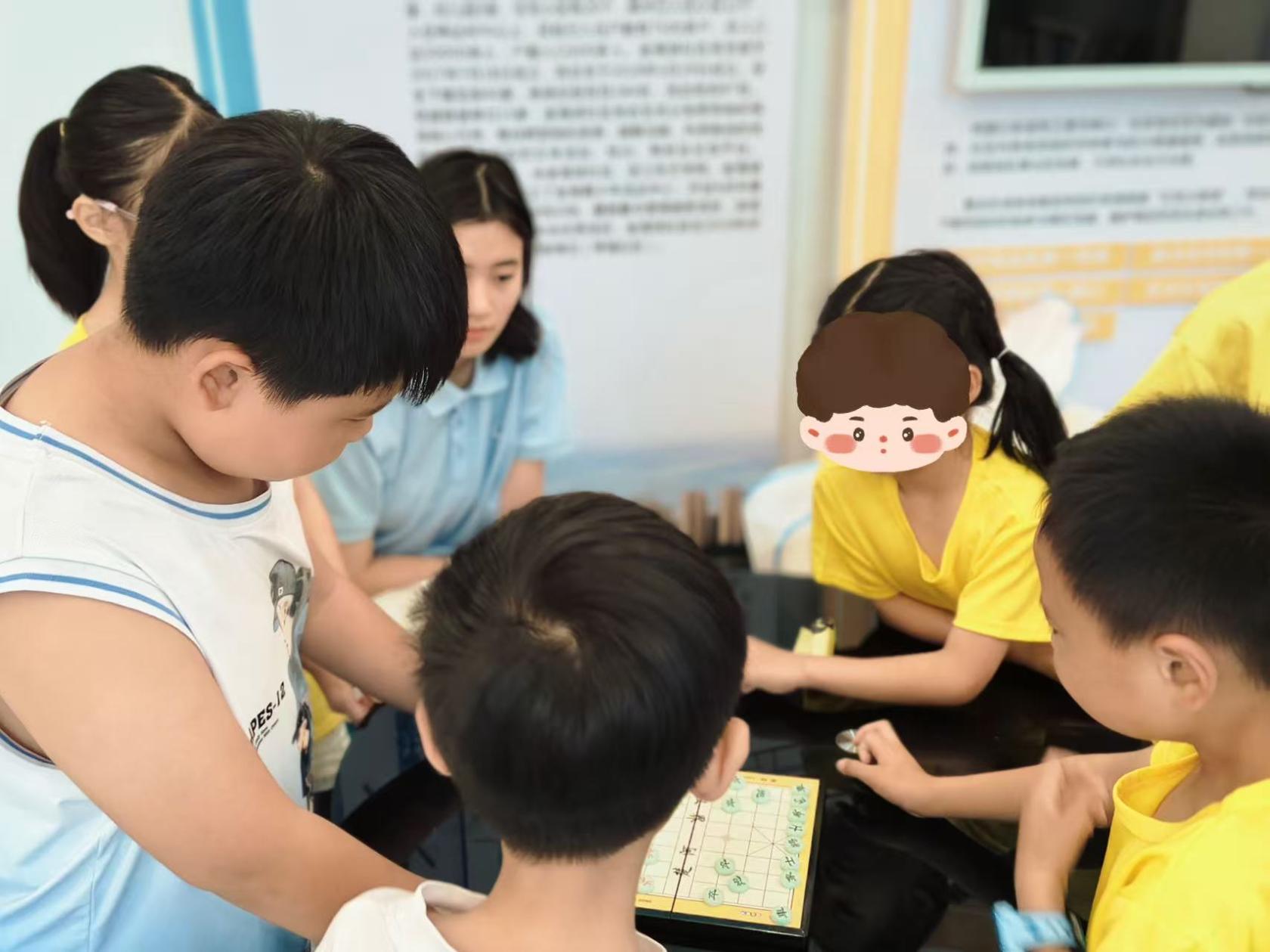 在活动中,队员们和孩子们围坐在一起,开展益智小游戏。象棋对弈区,小棋手们两两对坐,实践队队员化身“参谋”,在一旁轻声引导,启发孩子们思考棋局策略,锻炼思维能力。在互动里,陌生与距离悄然消散,信任和友谊慢慢滋生。